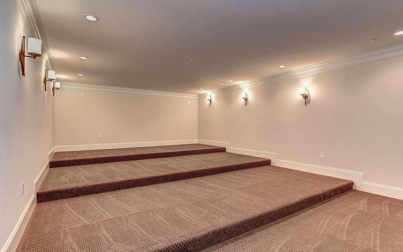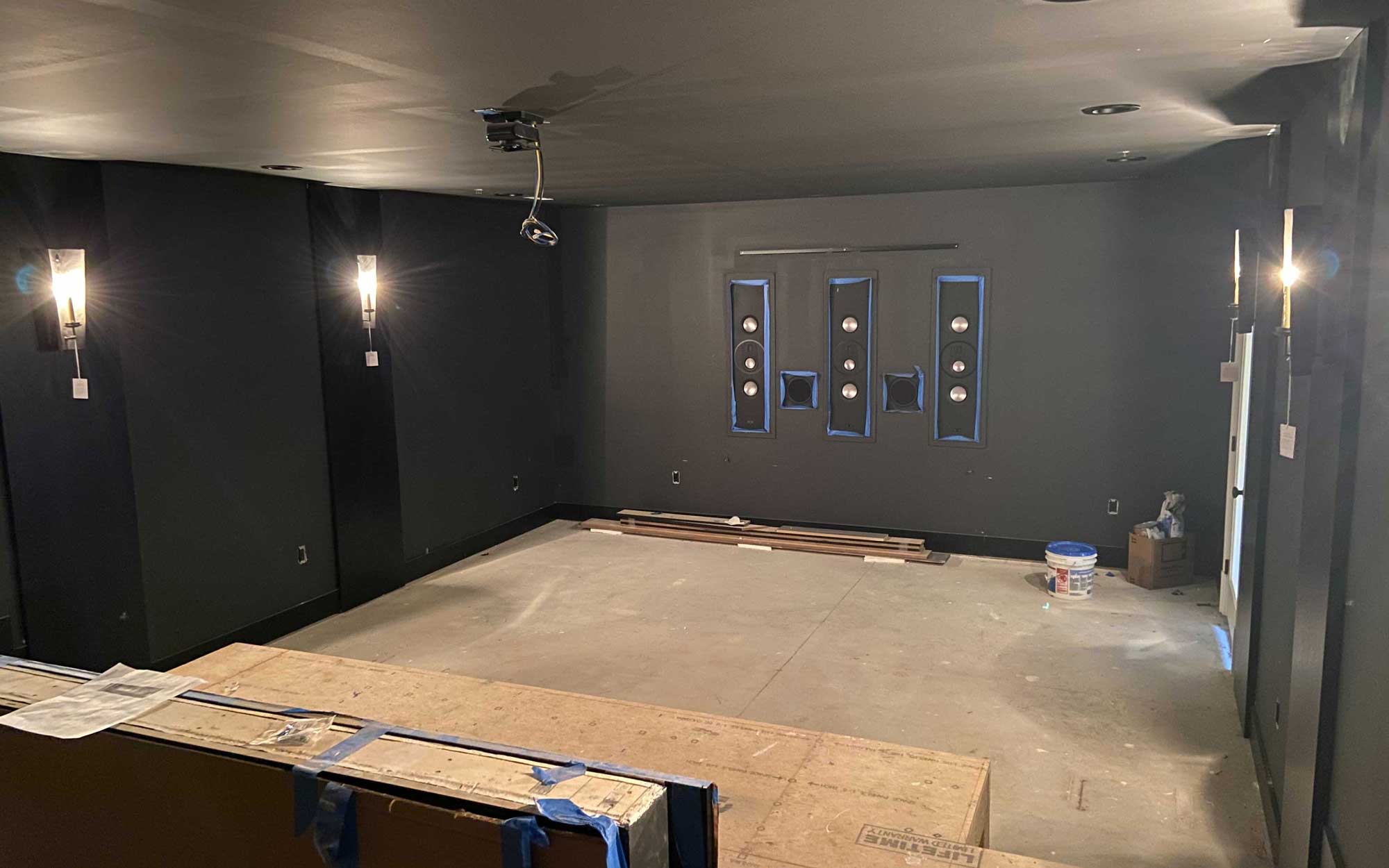 After our consultation, we worked with the builder and designer to take care of some of the room’s foundational problems. This included creating a raised riser for more efficient seating and upgrading the trim to black to match the design. During this stage, we also worked on installing any in-wall and in-ceiling components, conduits for additional fixtures and the projector, along with acoustic panels and bass traps.
