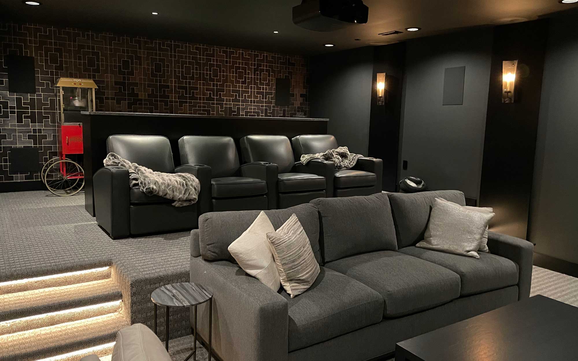 To finish things out, we added grills for the speakers and connected the projector. We then brought in the comfortable theater seating the client picked out, and, of course, last but not least, the much-needed popcorn machine in the back. We also programmed easy control for all the technology in the room. In this case, the client could use a remote or smart device based on each family member’s preference.