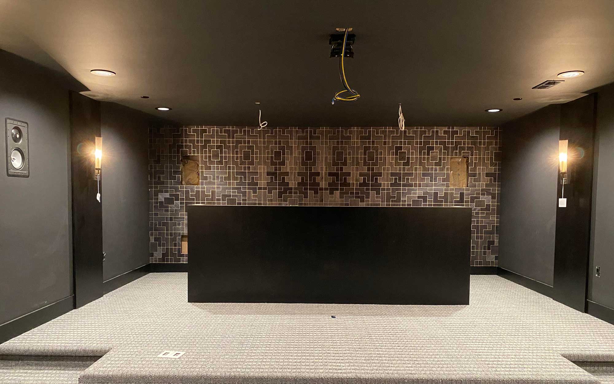 After our consultation, we worked with the builder and designer to take care of some of the room’s foundational problems. This included creating a raised riser for more efficient seating and upgrading the trim to black to match the design. During this stage, we also worked on installing any in-wall and in-ceiling components, conduits for additional fixtures and the projector, along with acoustic panels and bass traps.
